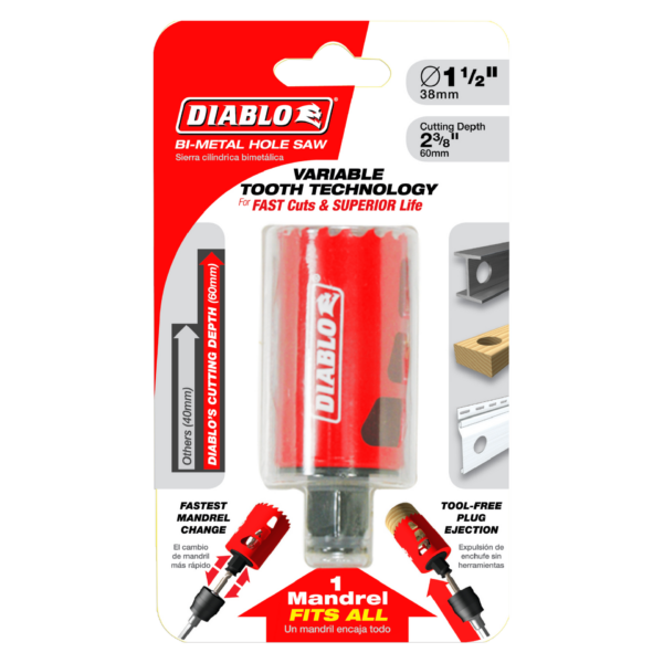 Diablo’s new, high-performance Bi-Metal Hole Saws deliver faster cutting performance and increased productivity. Unlike anything on the market, Diablo’s hole saw system and mandrel design simplify the attachment process for fast and efficient hole saw mounting. These radical new hole saws provide ultimate cutting length to bore deeper holes in a single pass, tool-free plug ejection and Variable Tooth Design for faster cuts.