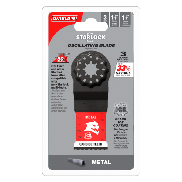 Diablo’s AMPED™ Steel Demon™ Starlock carbide teeth oscillating blades feature application specific designs that deliver extreme durability and superior cutting life in metal cutting. High performance TiCo Hi-Density carbide teeth deliver an unmatched up to 50X longer cutting life versus standard bi-metal blades. An optimized blade and tooth design, along with Black I.C.E. (Industrial Cooling Element) coating protects cutting edge against wear for extreme durability and longer blade life. Tool free quick-change interface fits Fein and other Starlock tools; also compatible with non-Starlock multi-tools.