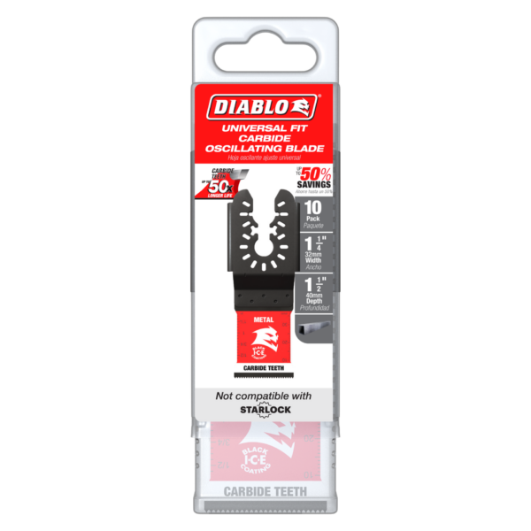 Diablo’s AMPED™ Steel Demon™ universal fit carbide teeth oscillating blades feature application specific designs that deliver extreme durability and superior cutting life in metals. High performance TiCo Hi-Density carbide teeth deliver an unmatched up to 50X longer cutting life versus standard bi-metal blades. An optimized blade and tooth design along with Black I.C.E. (Industrial Cooling Element) coating protects cutting edge against wear for extreme durability and longer blade life. The blade’s universal fit, adapter-free design easily attaches to most tools, with the exception of Starlock tools.