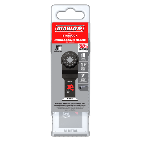 Diablo’s Steel Demon™ Starlock fit bi-metal oscillating blades feature application specific designs that deliver maximum durability and longer life in metal. These high-performance blades feature an ultra-hardened cutting edge to deliver up to 5X longer life than standard blades. An optimized tooth design reduces vibration for fast and clean cuts. Black I.C.E. (Industrial Cooling Element) coating protects cutting edge against wear for extreme durability and longer blade life. Tool free quick-change interface fits Fein and other Starlock tools; also compatible with most non-Starlock multi-tools.