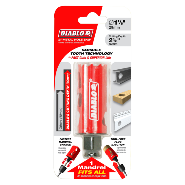 Diablo’s new, high-performance Bi-Metal Hole Saws deliver faster cutting performance and increased productivity. Unlike anything on the market, Diablo’s hole saw system and mandrel design simplify the attachment process for fast and efficient hole saw mounting. These radical new hole saws provide ultimate cutting length to bore deeper holes in a single pass, tool-free plug ejection and Variable Tooth Design for faster cuts.