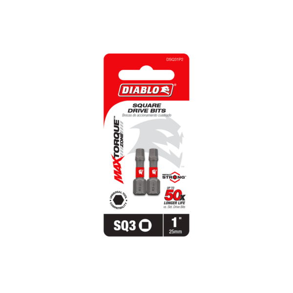 Diablo’s complete range of Square driver bits deliver maximum performance, extreme durability and up to 50X longer life when installing and removing fasteners. An optimized tip design provides a strong, precise grip that reduces wear, stripping and slippage. MaxTorque Zone delivers ultimate torque resistance by absorbing torque, creating less stress at the tip when tightening and removing nuts and screws. This range is Impact Strong™, delivering increased shank stability and durability in cordless and corded impact and drill drivers.