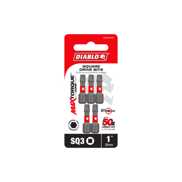 Diablo’s complete range of Square driver bits deliver maximum performance, extreme durability and up to 50X longer life when installing and removing fasteners. An optimized tip design provides a strong, precise grip that reduces wear, stripping and slippage. MaxTorque Zone delivers ultimate torque resistance by absorbing torque, creating less stress at the tip when tightening and removing nuts and screws. This range is Impact Strong™, delivering increased shank stability and durability in cordless and corded impact and drill drivers.