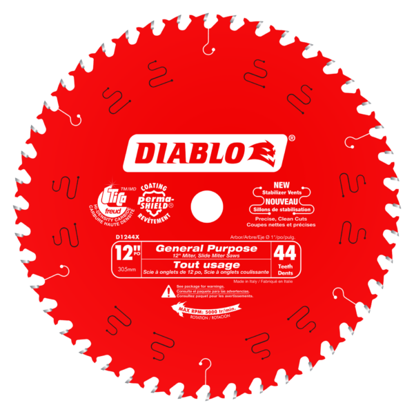 Diablo’s General Purpose Saw Blade for Wood is ideal for cutting oak, pine, plywood, pressure treated lumber and beams. An excellent choice for table & miter saws, Diablo’s blade leaves a smooth cut in a variety of applications, reducing the need to change blades between tasks. Use it for rip cuts with a smoother finish than dedicated ripping blades or make quality crosscuts in solid wood or plywood. Great for both sliding and “chop” style miter saws as well as table saws.