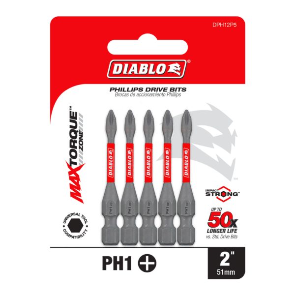 Diablo’s driver bit range of Phillips bits delivers maximum performance, extreme durability and up to 50X longer life when installing and removing fasteners. An optimized tip design provides a strong, precise grip that reduces wear, stripping and slippage. MaxTorque Zone ultimate torque resistance absorbs torque for less stress at the tip when tightening and removing nuts and screws. This range is Impact Strong™, delivering increased shank stability and durability in cordless and corded impact and drill drivers.