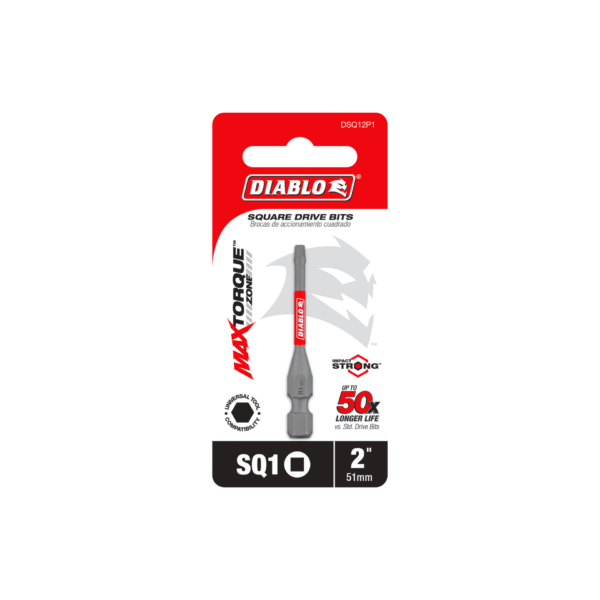 Diablo’s driver bit range of Square bits delivers maximum performance, extreme durability and up to 50X longer life when installing and removing fasteners. An optimized tip design provides a strong, precise grip that reduces wear, stripping and slippage. MaxTorque Zone delivers ultimate torque resistance by absorbing torque, creating less stress at the tip when tightening and removing nuts and screws. This range is Impact Strong™, delivering increased shank stability and durability in cordless and corded impact and drill drivers.