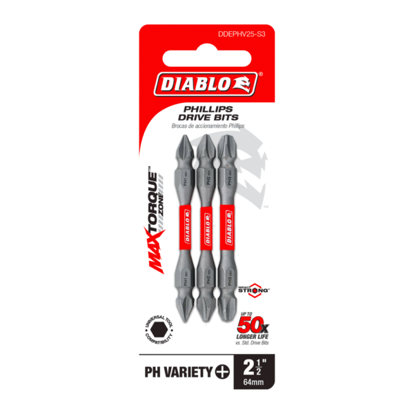 Diablo’s driver bit range of Phillips bits delivers maximum performance, extreme durability and up to 50X longer life when installing and removing fasteners. An optimized tip design provides a strong, precise grip that reduces wear, stripping and slippage. MaxTorque Zone delivers ultimate torque resistance by absorbing torque, creating less stress at the tip when tightening and removing nuts and screws. This range is Impact Strong™, delivering increased shank stability and durability in cordless and corded impact and drill drivers.