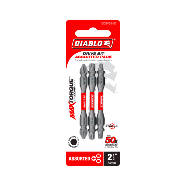 Diablo’s driver bit range of Phillips, Square and Torx bits delivers maximum performance, extreme durability and up to 50X longer life when installing and removing fasteners. An optimized tip design provides a strong, precise grip that reduces wear, stripping and slippage. MaxTorque Zone delivers ultimate torque resistance by absorbing torque, creating less stress at the tip when tightening and removing nuts and screws. This range is Impact Strong™, delivering increased shank stability and durability in cordless and corded impact and drill drivers.