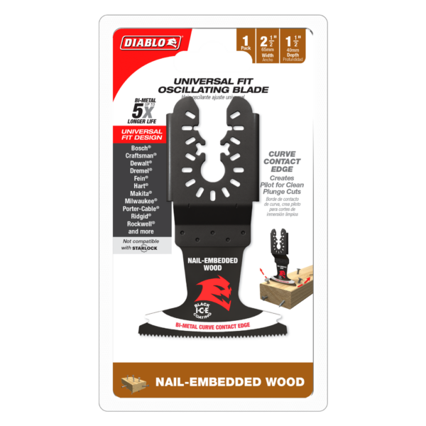 Diablo’s universal fit bi-metal oscillating blades feature application specific designs that deliver maximum durability and longer life in nail-embedded wood applications. These high-performance blades feature an ultra-hardened cutting edge to deliver up to 5X longer life than standard blades. Curve contact edge creates a pilot for precise, clean plunge cuts with less vibration. Black I.C.E. (Industrial Cooling Element) keeps the teeth cool and build up free for fast, clean cuts. The blade’s universal fit, adapter-free design easily attaches most tools, with the exception of Starlock tools.
