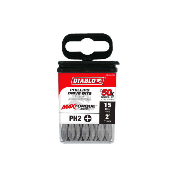 Diablo’s driver bit range of Phillips bits delivers maximum performance, extreme durability and up to 50x longer life when installing and removing fasteners. An optimized tip design provides a strong, precise grip that reduces wear, stripping and slippage. Torque Resistant Design absorbs torque for less stress at the tip when tightening and removing nuts and screws. This range is Impact Strong™, delivering increased shank stability and durability in cordless and corded impact and drill drivers.