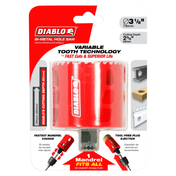 Diablo’s new, high-performance Bi-Metal Hole Saws deliver faster cutting performance and increased productivity. Unlike anything on the market, Diablo’s hole saw system and mandrel design simplify the attachment process for fast and efficient hole saw mounting. These radical new hole saws provide ultimate cutting length to bore deeper holes in a single pass, tool-free plug ejection and Variable Tooth Design for faster cuts.