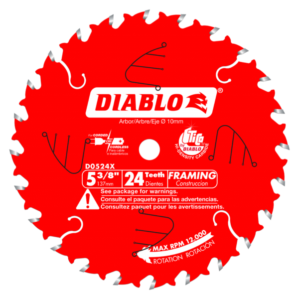 Diablo’s Framing Saw Blade for Wood is ideal for general construction applications, including fast, efficient ripping and crosscutting. Diablo’s blade cuts rough framing lumber, high quality finish lumber, plywood, OSB, and hardboard siding with the smoothest, fastest and most accurate cut. The thin kerf design requires less cutting power from the user and the saw for better control over the cut. Diablo′s unique design, extra-tough steel plate and proprietary carbide tips deliver longer life — and frames more houses — than other framing blades